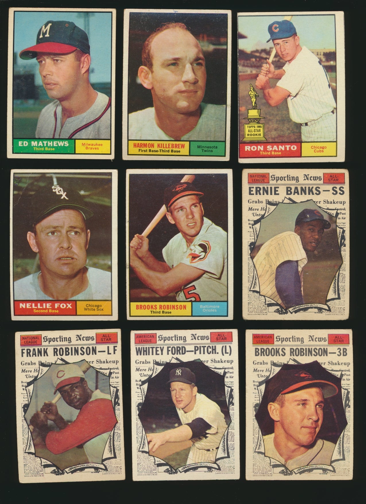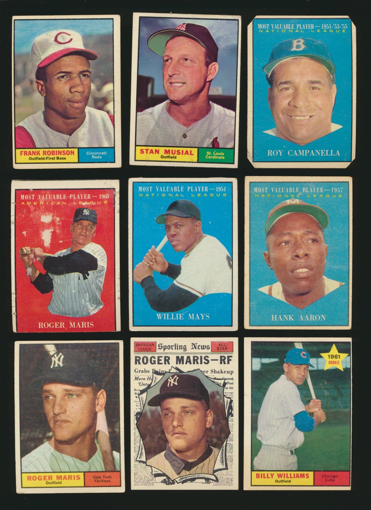 Condition Info: Overall, this set is in Poor to EX-MT condition, while the majority of the cards falls in the VG range. Stars include: 300 Mantle (Poor, staple holes), 578 Mantle AS (Poor, discoloration), 287 Yastrzemski VG-EX, 579 Mays AS (VG - discoloration left side), 577 Aaron AS (GD, corner crease), 150 Mays (G/VG, couple of spots of surface damage), 475 Mantle MVP (Pr, Paper loss front), 344 Koufax (EX), 388 Clemente (VG, wrinkle), Campny (corners clipped). See scans for a sampling of condition. There are 0 graded cards in this break; they all are ungraded!