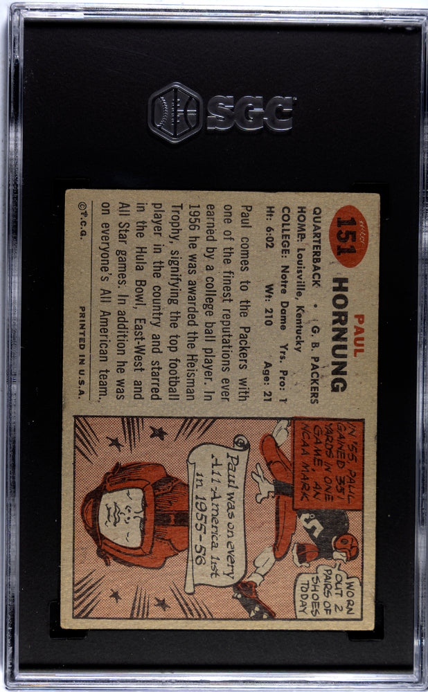 You are purchasing a 1957 Topps Paul Hornung #151 SGC 5. You will receive the exact item in the photographs. Thank you for looking. Listed With Mascot.