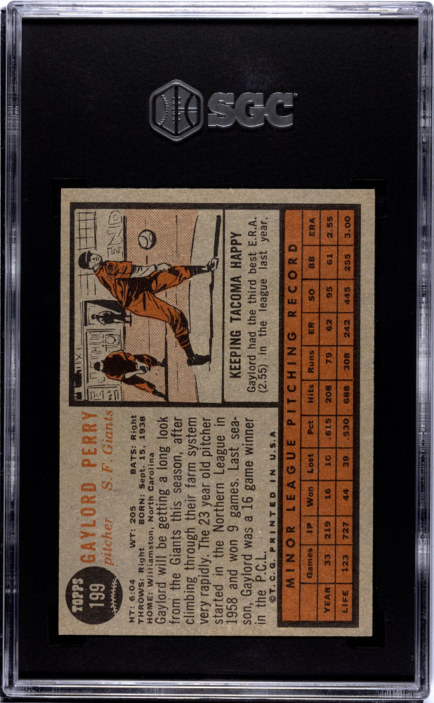 You are purchasing a 1962 Topps Gaylord Perry #199 SGC 8. You will receive the exact item in the photographs. Thank you for looking. Listed With Mascot.