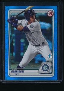 This listing is for 2020 Bowman 1st Edition Julio Rodriguez Blue Foil /150 Pack-Fresh 14672. Pack-fresh card. Very minor corner wear on bottom-left corner would prevent this card from being GEM MINT.